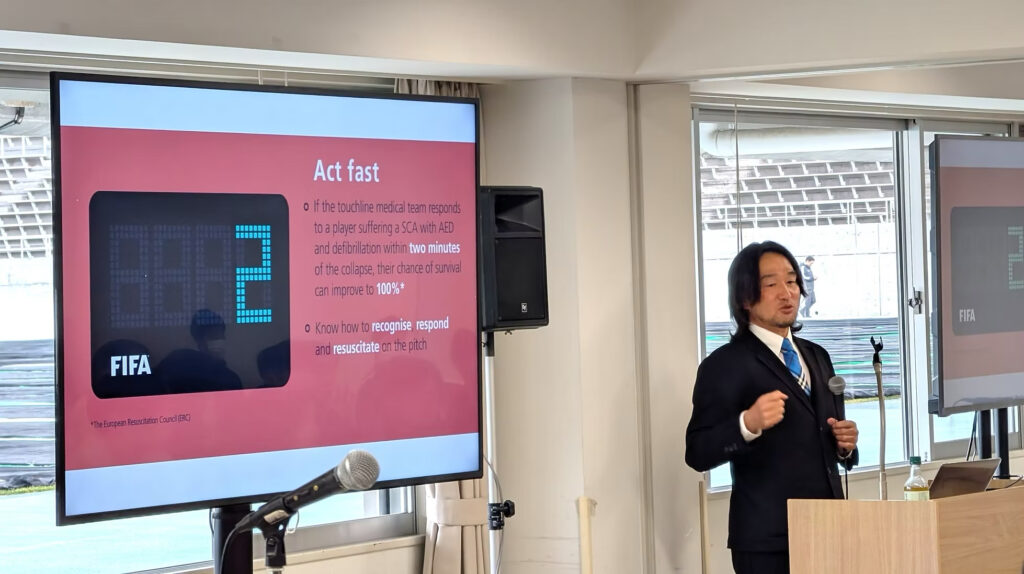 講演タイトルは「あなたの一次救命処置、本当に大丈夫ですか?」で選手などが心停止に陥った際に必要となる、一次救命処置についてのべました。