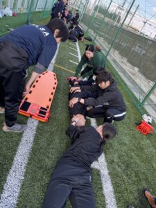 この講習会は日本サッカー協会が開発した、スポーツ現場で起こりうる心停止や脳振盪、熱中症などに対応できるための講習会です。